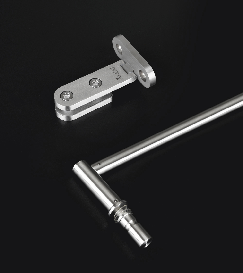 Leni 是款『雙向運動』的玻璃門鉸鏈。秉持原廠一貫的製造工藝,整副鉸鏈使用純不鏽鋼材為原料,以CNC加工完成的Leni,具備了一體成形的外貌及精度,不同於其他品牌以大批量產的產品。