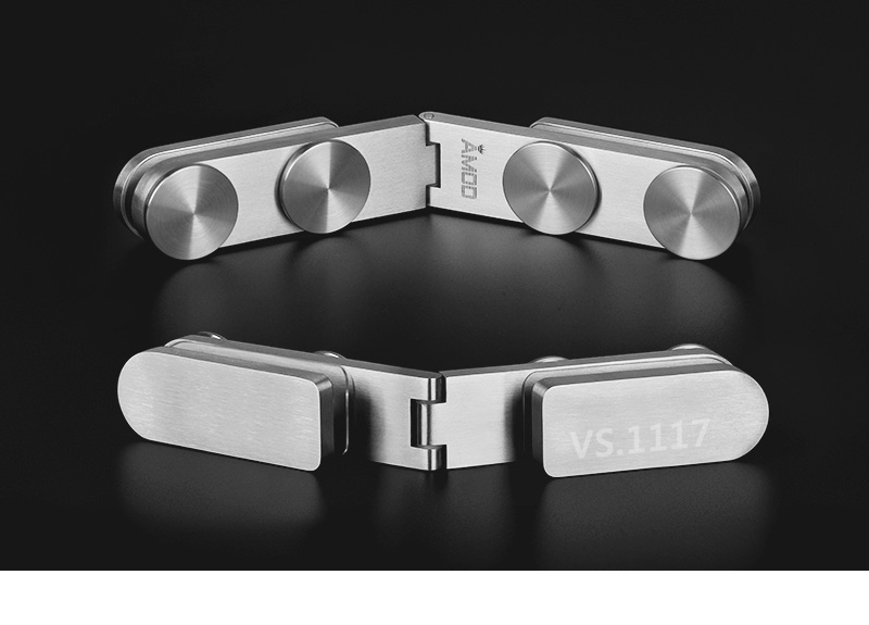 Volkslime玻對玻鉸鏈,秉持AMOD一貫的純鋼材結構設計,即便是細微如螺絲蓋,均採用純304不鏽鋼加工而成,表面覆以手工髮絲紋路。Volkslime鉸鏈同時提供平頭夾及漏斗夾玻璃夾頭,對應8~10mm 厚度玻璃使用。