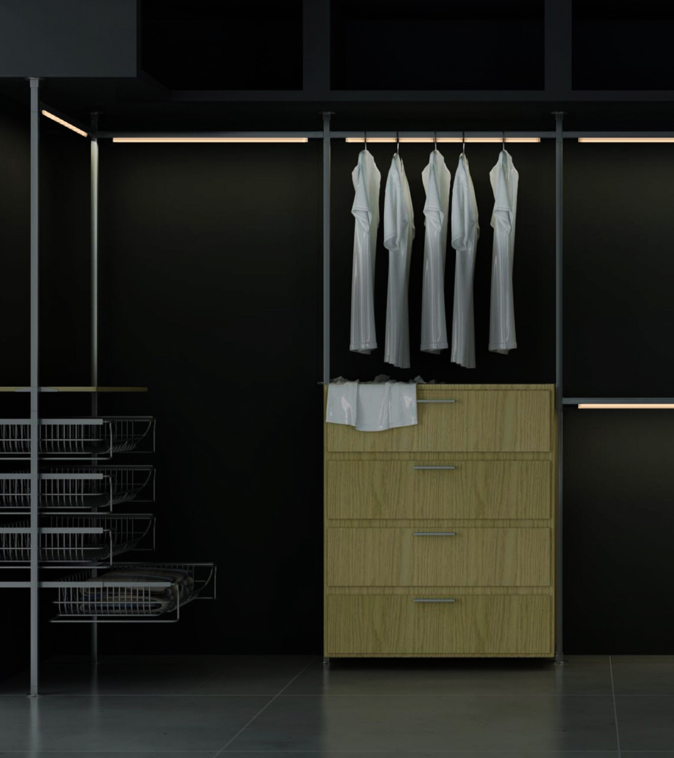 ■ 掛衣橫桿(H40*W27mm) 使用壁厚1.8mm高強度不鏽鋼,適合衣櫃長跨距設計,木作隔板/ 立柱連接/ 吊頂 三種類型櫃體均有對應套件。 ■ 搭配飛利浦LED層板燈管 四種燈管長度(310 /570 /870 /1170mm) 以無縫連結方式客製所需跨距,更貼合設計師規劃彈性。 三種色溫(3000k /4000k /6500k) 燈管演色性佳,品質符合國際標準,模組化設計無外接變壓器,安裝及日後更換燈管簡便,單一電源可串連至多12支燈管。