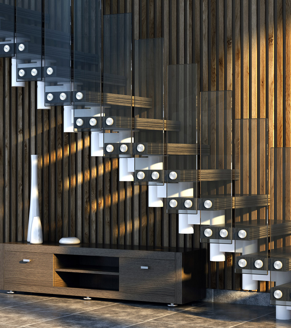Knopeli系列成功地將不鏽鋼的堅固特質延伸到室內階梯設計上。藉由精拋光的實心不鏽鋼玻璃夾具,配合精緻的特殊固定螺絲,搭配以玻璃為介面,簡潔而富現代感,顛覆傳統階梯扶手呆板造型。