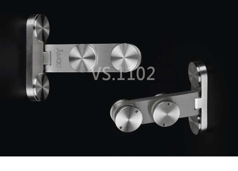 Volkslime玻對玻鉸鏈,秉持AMOD一貫的純鋼材結構設計,即便是細微如螺絲蓋,均採用純304不鏽鋼加工而成,表面覆以手工髮絲紋路。Volkslime鉸鏈同時提供平頭夾及漏斗夾玻璃夾頭,對應8~10mm 厚度玻璃使用。