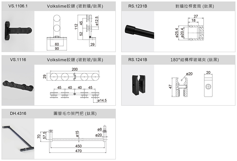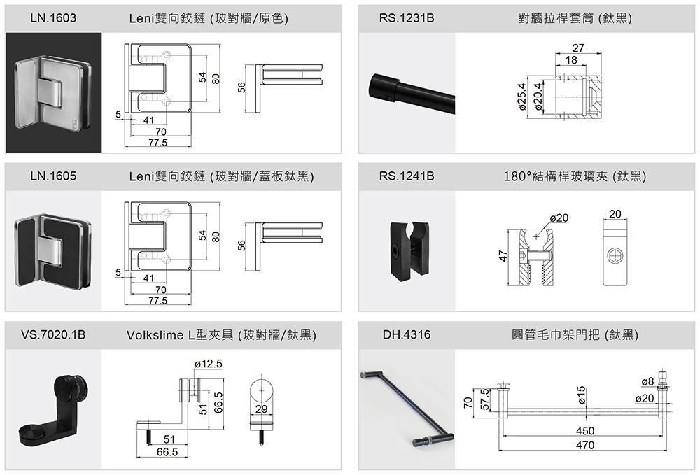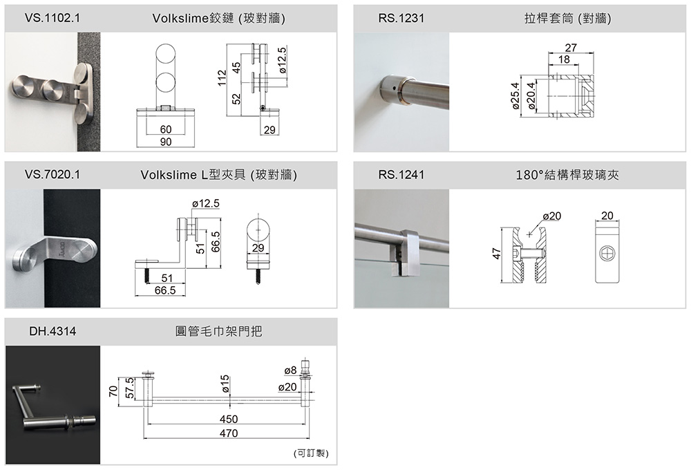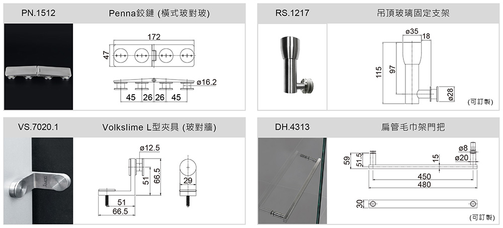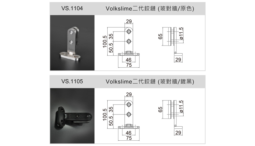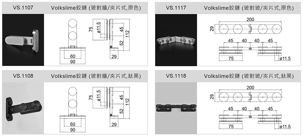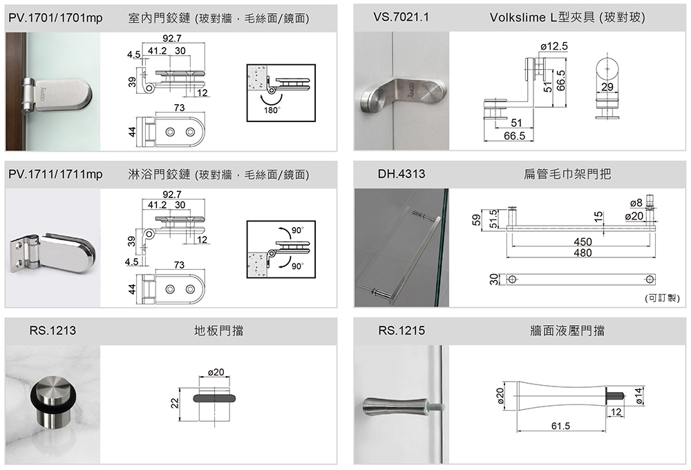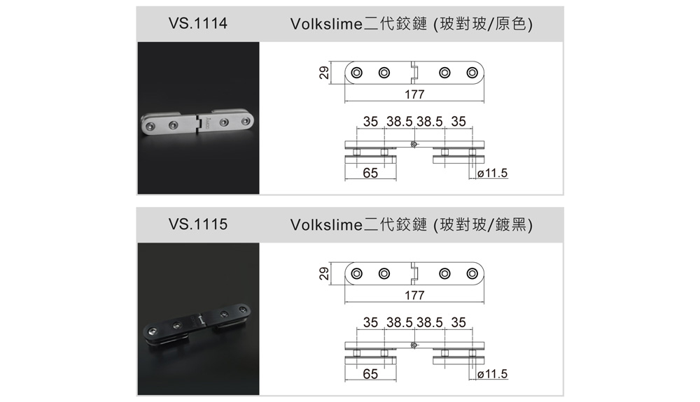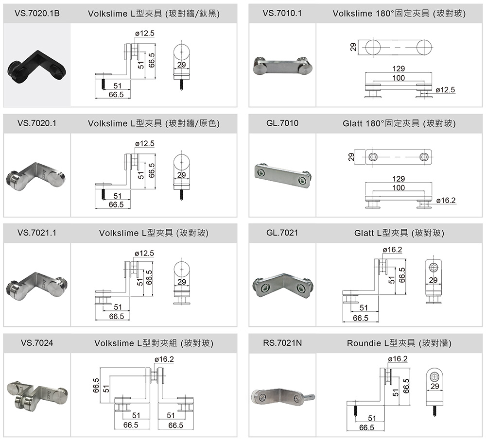 Volkslime系列鉸鏈提供更多樣的選擇性,玻璃固定夾推出「長夾片款式」。可對應8~10mm 厚度玻璃使用。