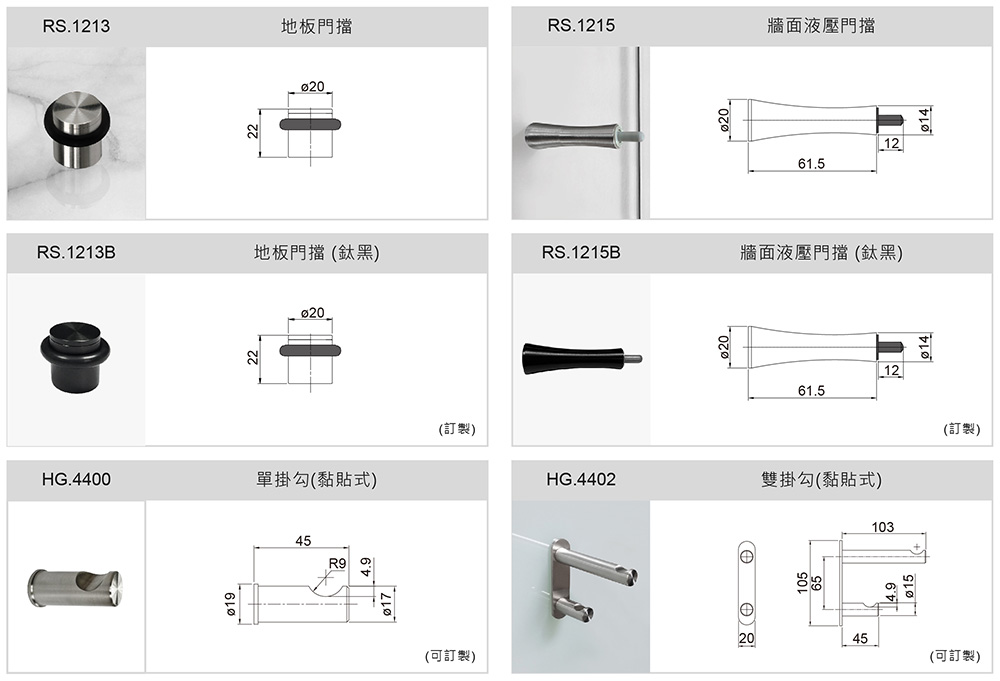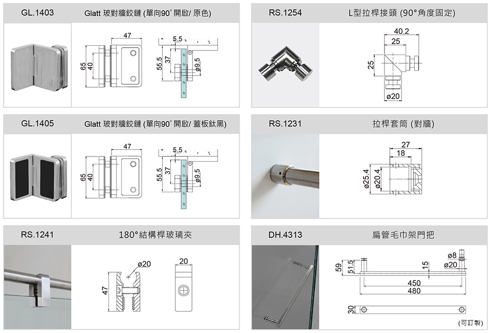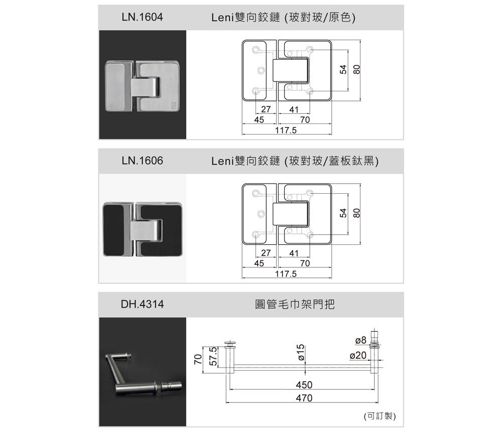 師傅手拋毛絲表面無電鍍,正面、反面一樣美觀。玻對牆鉸鏈同時提供不鏽鋼原色/鈦黑色。