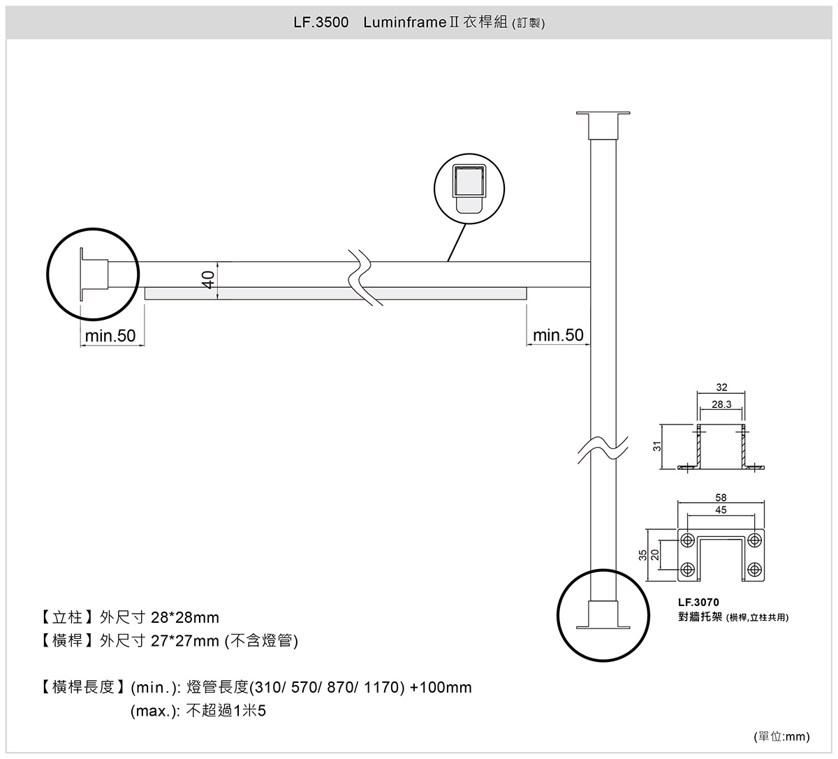 ■ 掛衣橫桿(H40*W27mm) 使用壁厚1.8mm高強度不鏽鋼,適合衣櫃長跨距設計,木作隔板/ 立柱連接/ 吊頂 三種類型櫃體均有對應套件。 ■ 搭配飛利浦LED層板燈管 四種燈管長度(310 /570 /870 /1170mm) 以無縫連結方式客製所需跨距,更貼合設計師規劃彈性。 三種色溫(3000k /4000k /6500k) 燈管演色性佳,品質符合國際標準,模組化設計無外接變壓器,安裝及日後更換燈管簡便,單一電源可串連至多12支燈管。