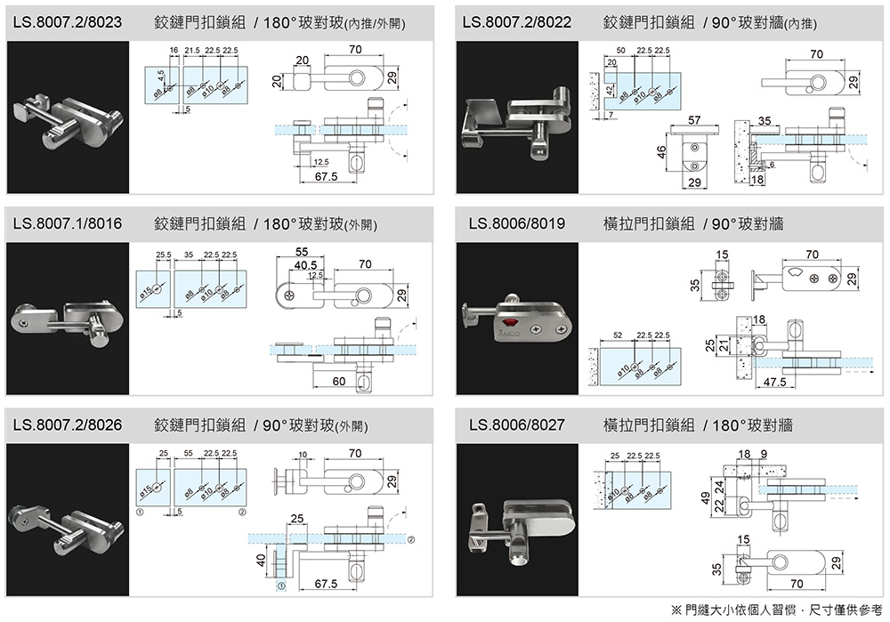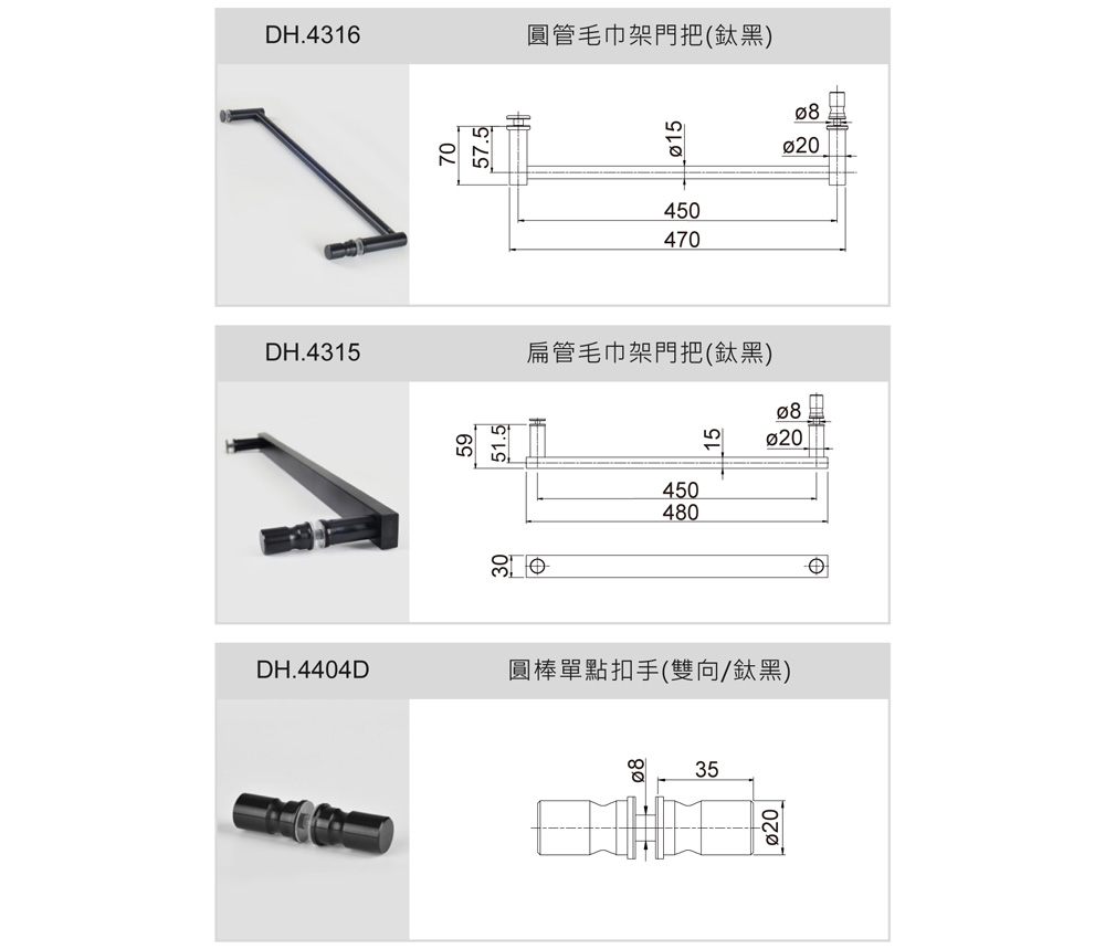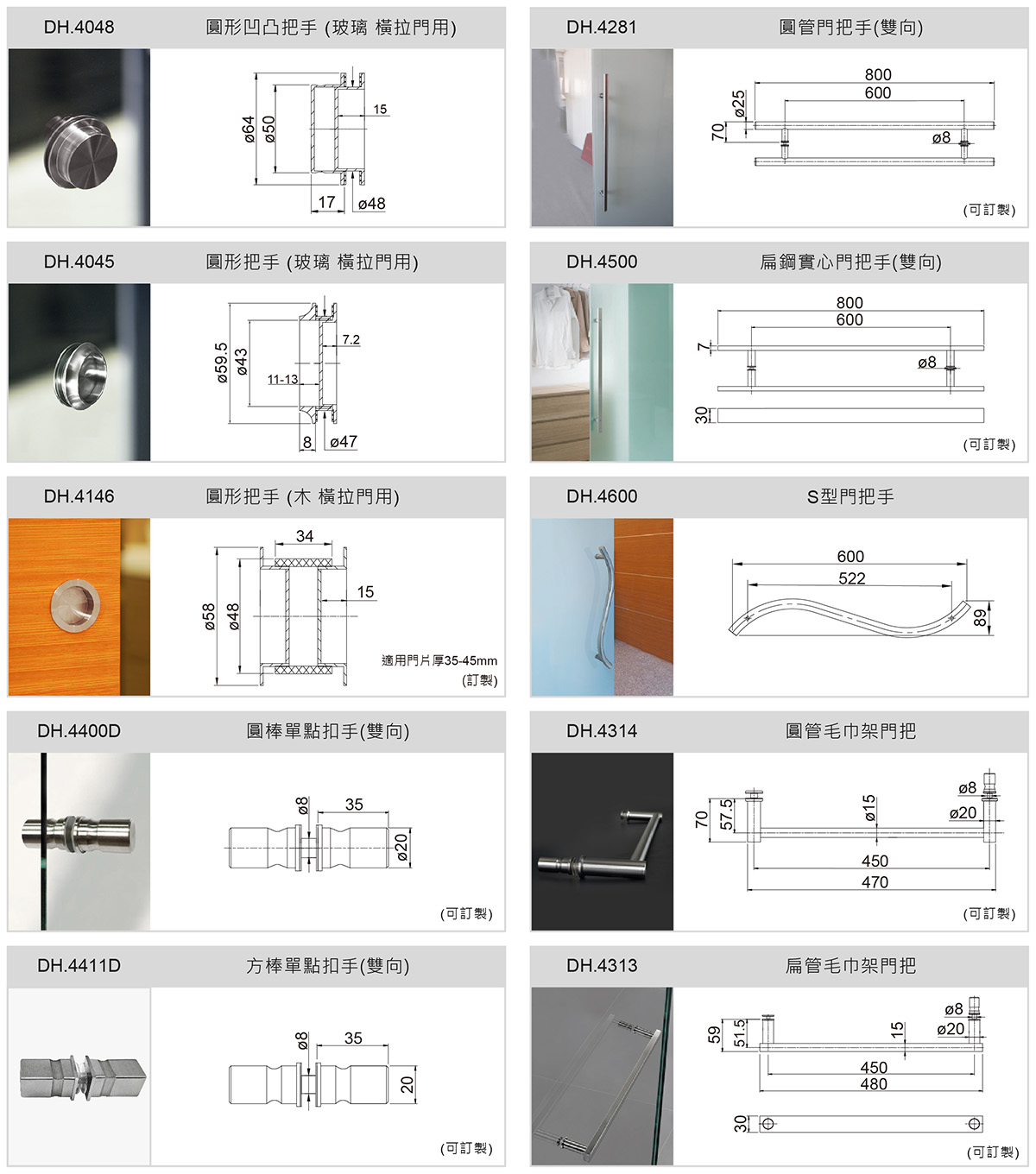 針對不同形式的玻璃門,提供了多款門把手樣式供選擇 (詳Info),也可根據設計需求來客製。